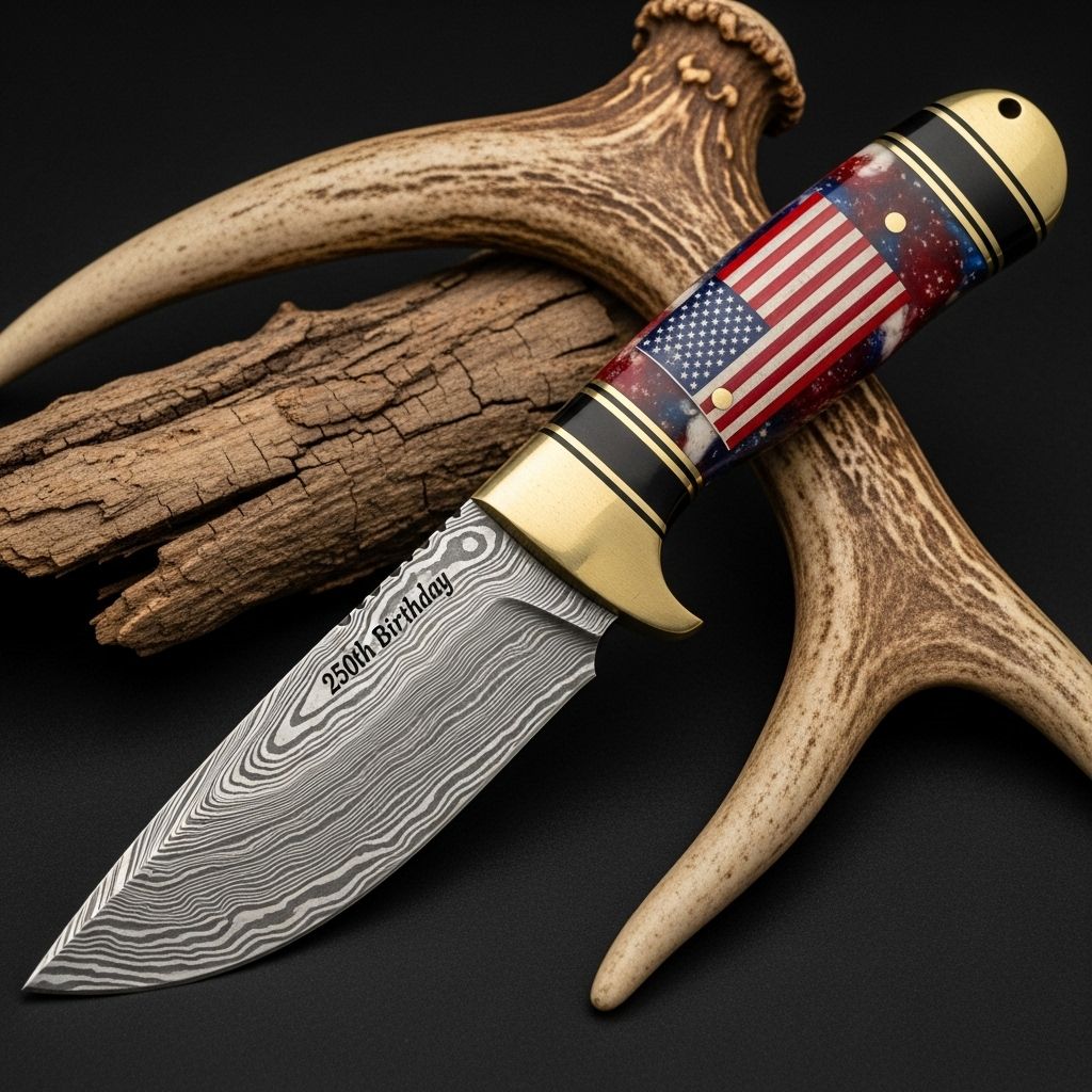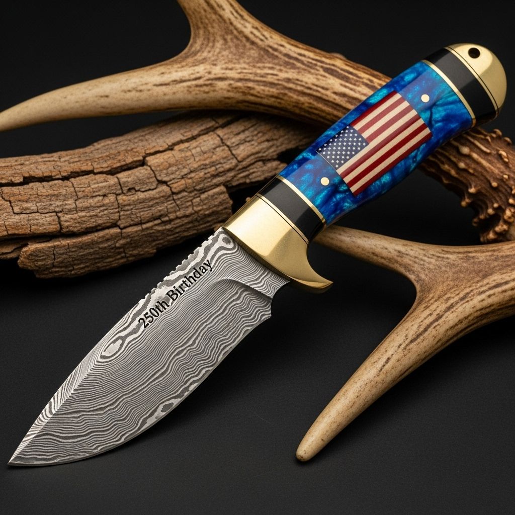Exquisite Exclusive 250th Anniversary Damascus Steel Knife featuring patriotic engraved bolsters (e.g., Eagle/Stars motif) and handle scales crafted from premium stabilized wood or composite materials with subtle USA/250 accents.