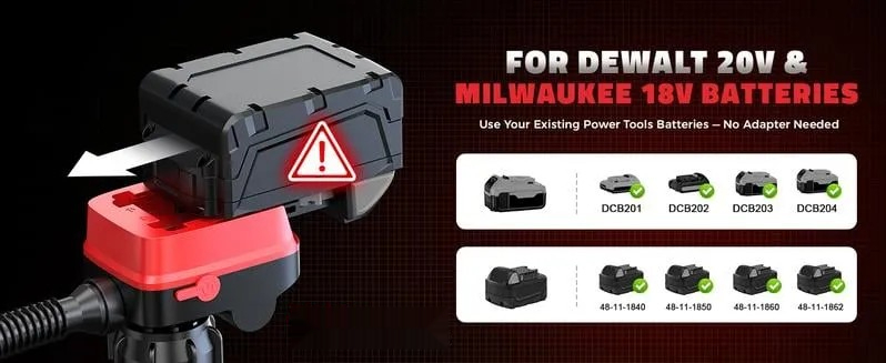 Enjoy true portability with a battery-powered design — no cords, no limits. Our pump is built to work directly with the most popular tool batteries you already own: