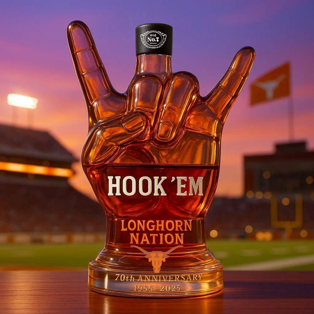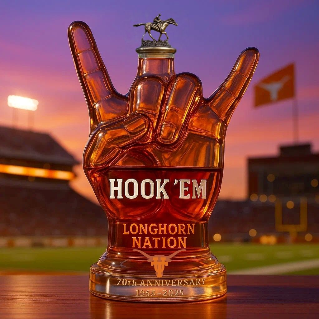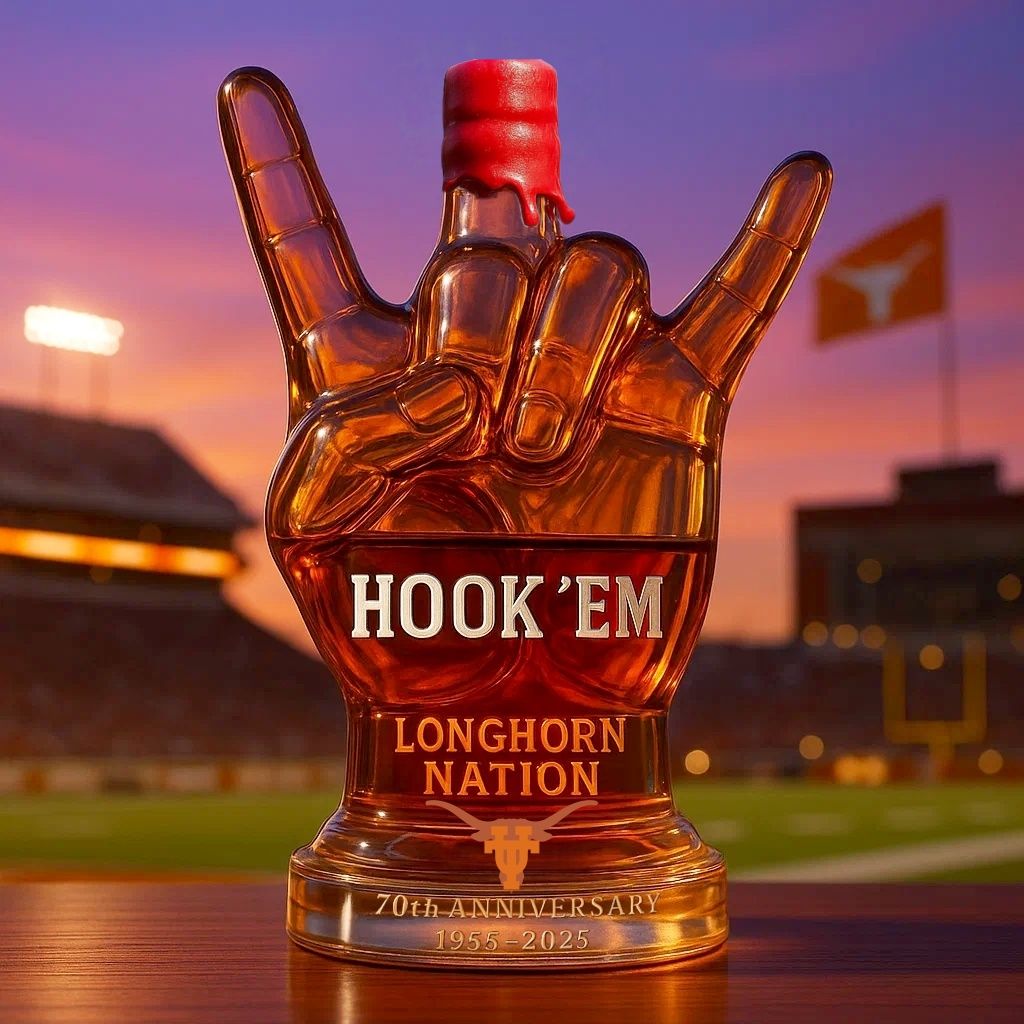 🤘 This limited-edition Hook ’Em Tribute Bottle celebrates 70 years of burnt-orange tradition — from the first roar in 1955 to every echo in Darrell K Royal Stadium today.